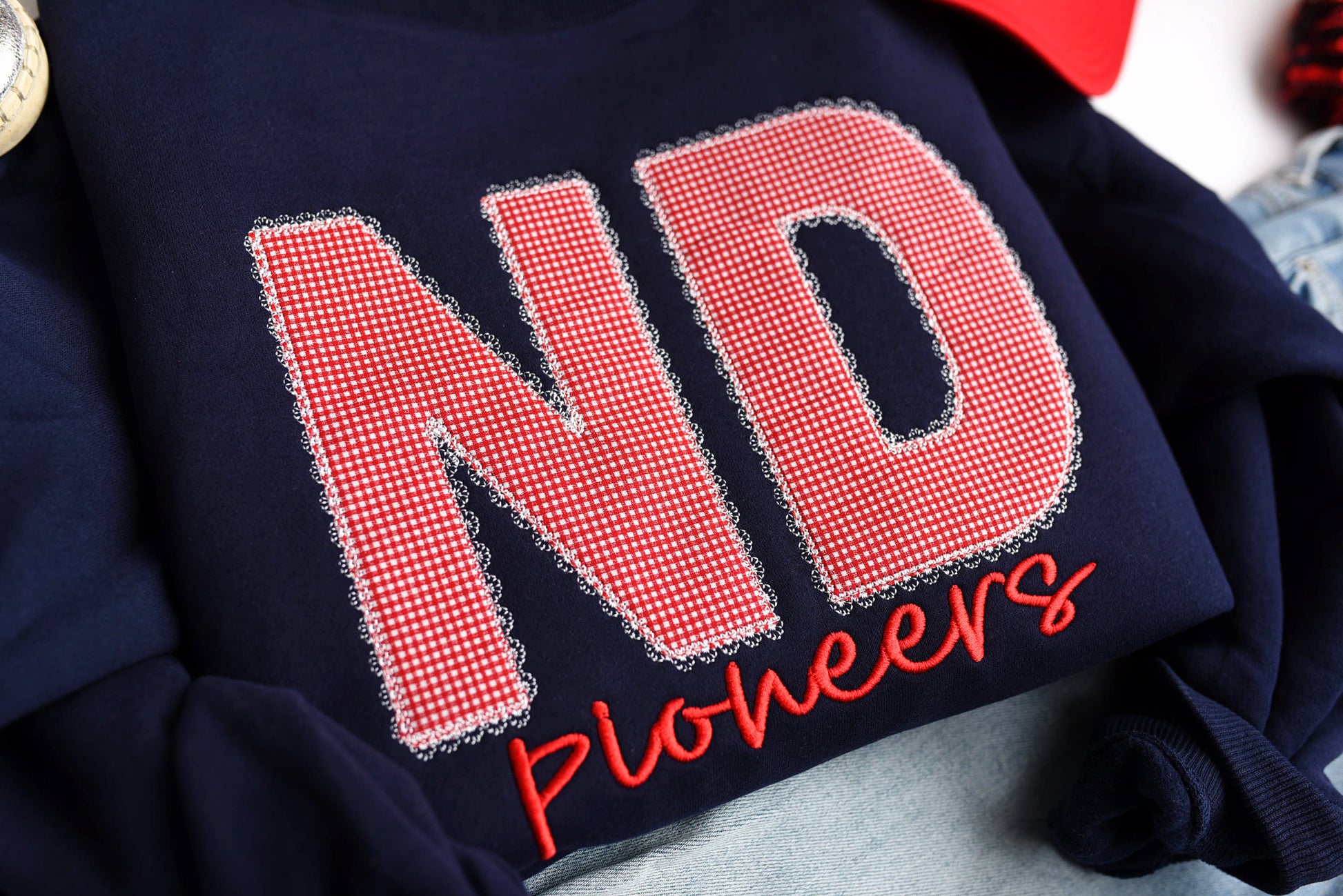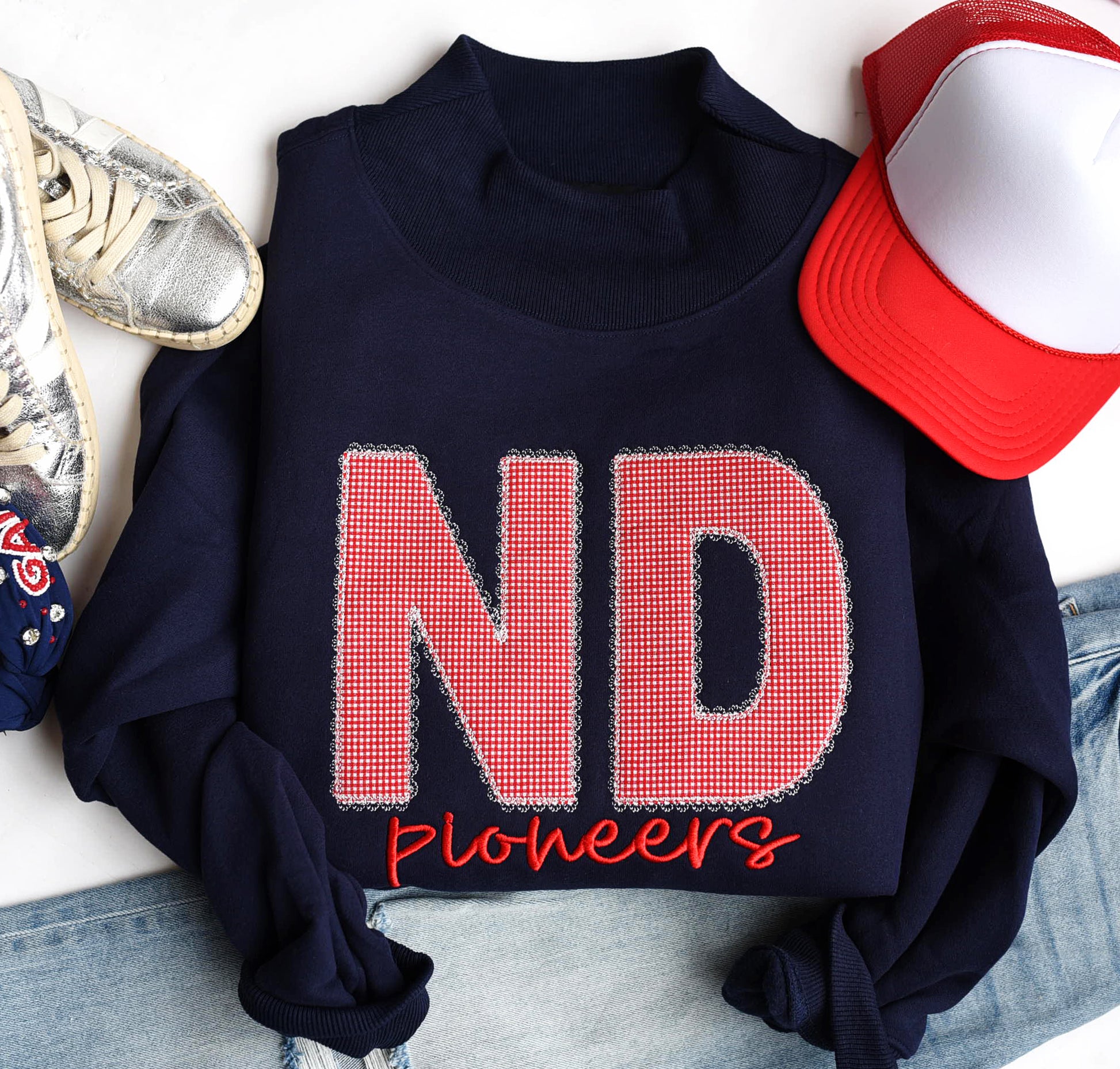 These mocknecks are oversized! So if in between sizes I suggest sizing down. Please put your color requests in the order notes before checking out. ex: 1. ND red gingham 2. pioneers red. 3. Lace White **THE LACE outline will be unless otherwise noted** FINAL SALE. 2-3 week TAT!!!!
