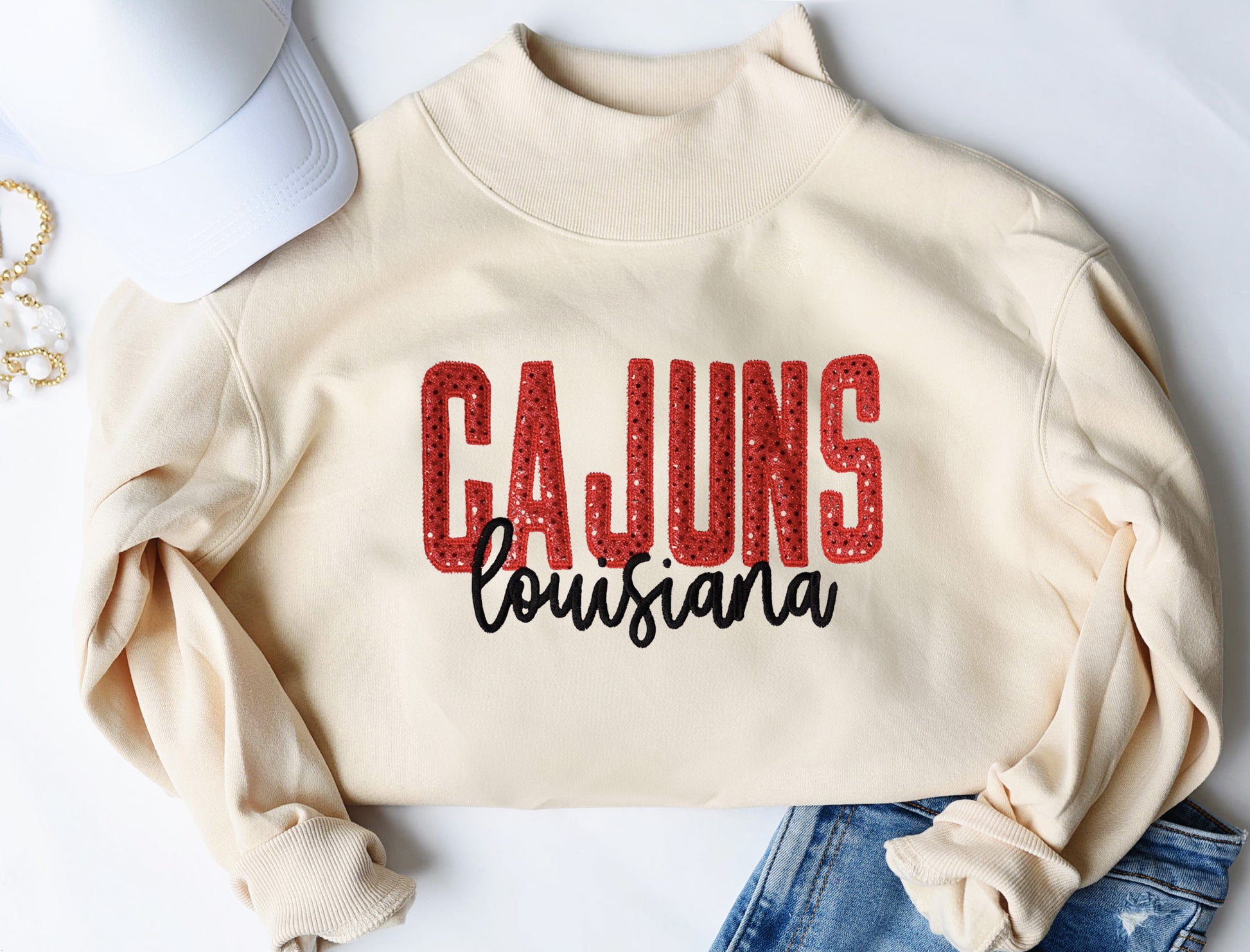 Confetti dot sequin applique with satin stitch! These are done on a Gildan brand sweatshirt. Unisex sizing. Final sale. TAT is 2-3 weeks. **CUSTOMIZE in the order notes. 1. Sequin color and WORD (ex: Red Cajuns) 2. Satin stitch color thread and WORD (ex: Black Louisiana). **OVERSIZED FIT** GO DOWN ONE.