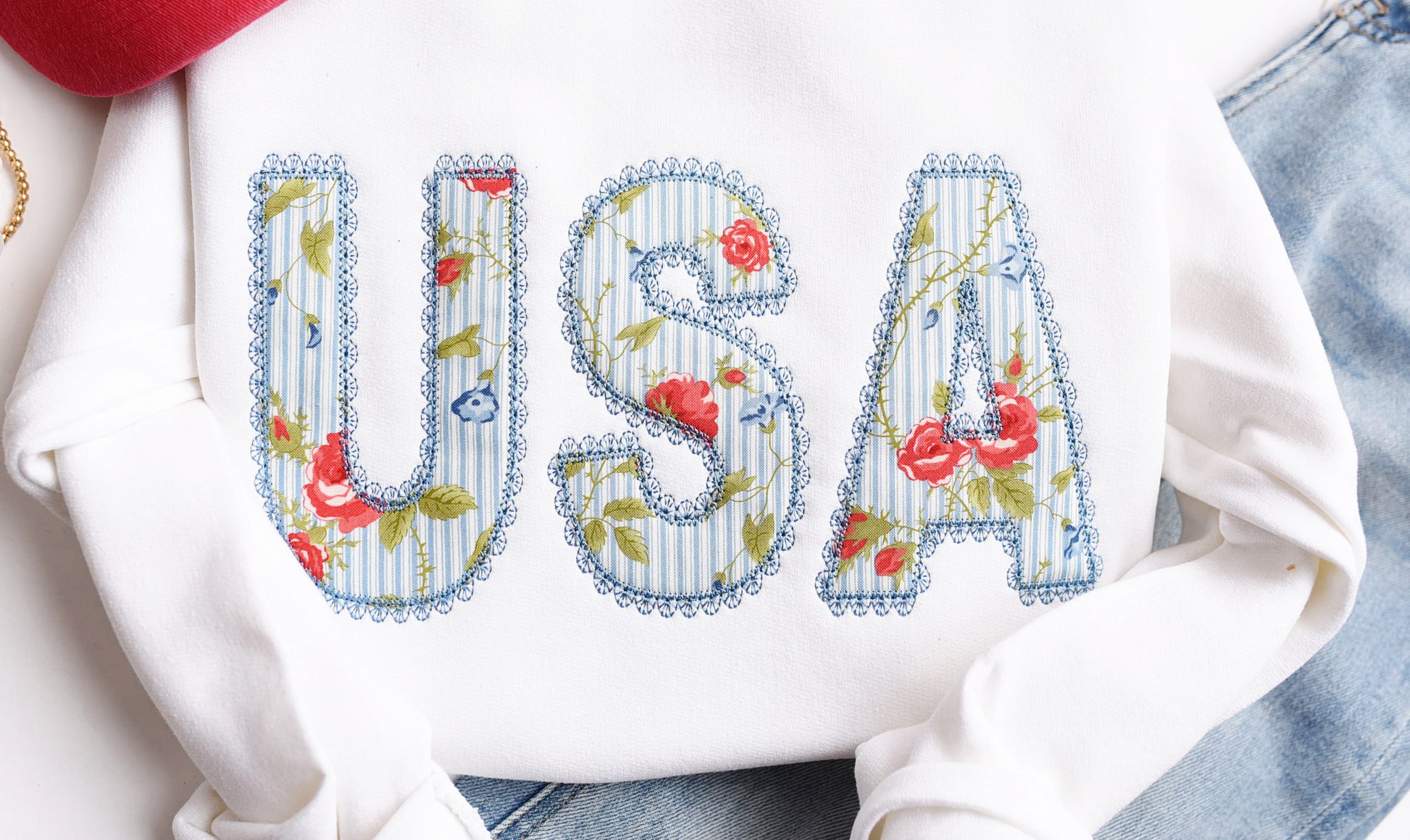 HOW cuteee is this?? USA floral applique with lace stitch detail. FINAL sale with a 3-4 week TAT. Sweatshirt is Gildan brand. T-shirt will be on comfort colors. SEE SIZE chart for reference. UNISEX.